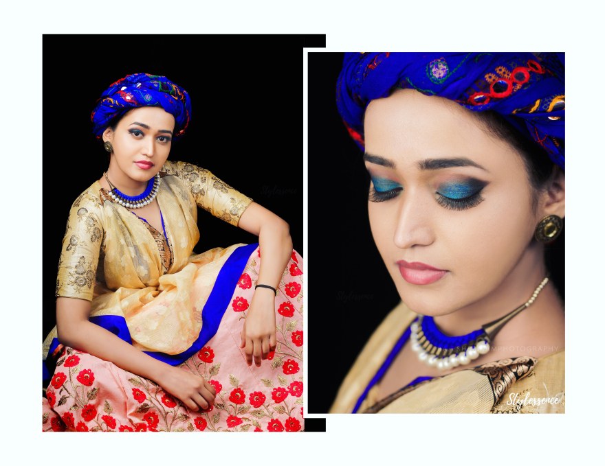This look plays with the Quirky style of an Indian woman yet it gives a royal touch. We played with colours like pink and blue and florals for the fresh spring look still giving it a royal twist with a touch of gold and a turban.